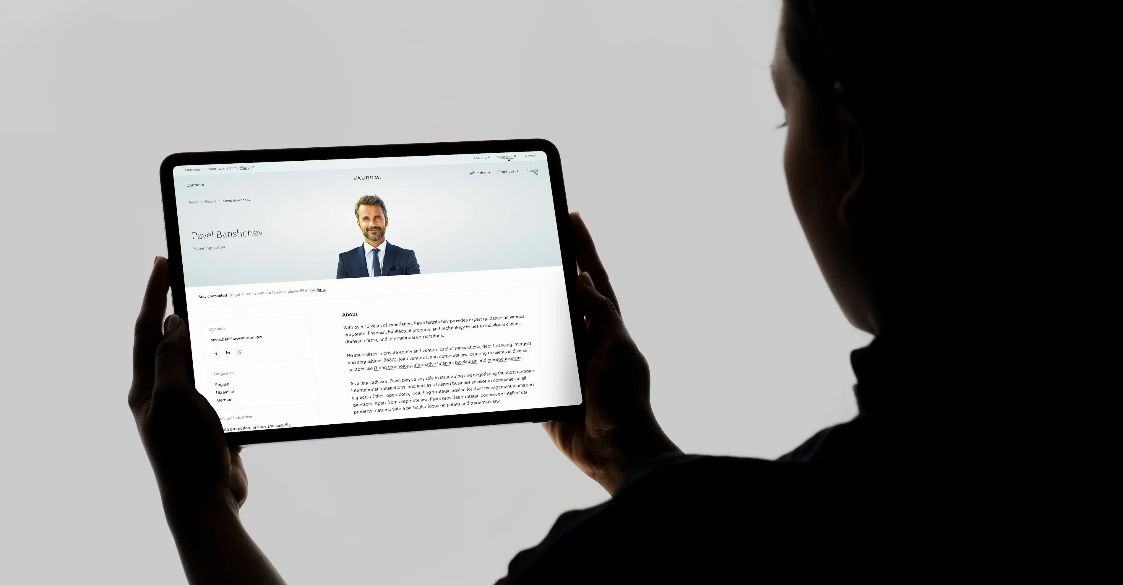This means the attorney profile page must include: a corporate email address on the firm's domain (not Gmail or Hotmail - this immediately looks unprofessional), a link to the lawyer's LinkedIn profile, and the office address if the firm operates from multiple locations. A direct phone number may be appropriate in some cases, though this is less common among Ukrainian firms than their European counterparts.