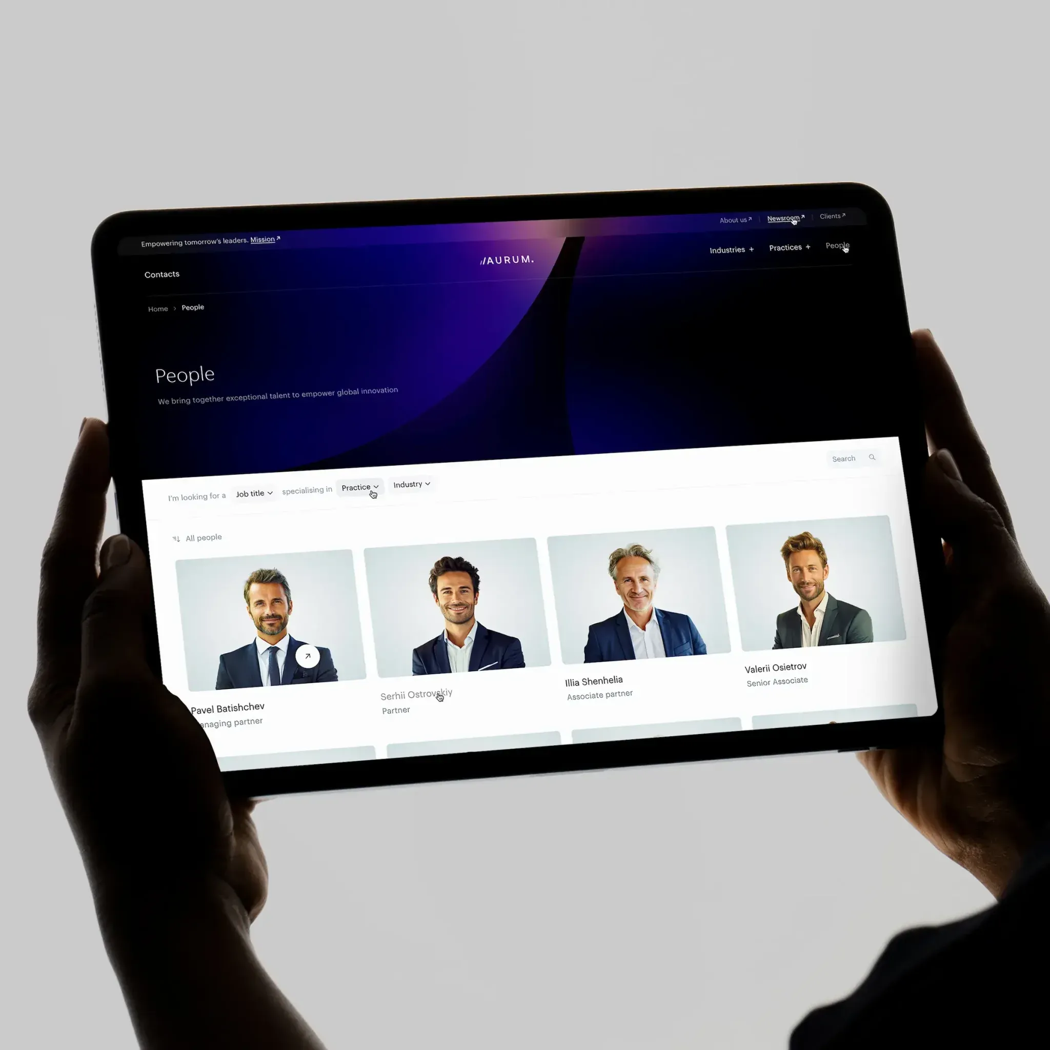 The minimum set of filters: by office (if the firm operates across multiple locations), by practice or industry, and by position (partner, counsel, associate). For larger firms, it's useful to add a name search - a simple text field that filters the list in real time.